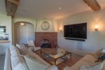 The main living area presents a fluid blend of comfort and style, featuring dual gas fireplaces that set a serene atmosphere for gatherings. It includes a spacious family zone with a large television, a state-of-the-art kitchen, and an expansive dining area. A unique addition is the second television built into the kitchen island, complemented by a cozy sitting area for those who enjoy staying abreast of news or entertainment. For added convenience, a chic half bath is accessible from the front hall, and a dedicated television room on the first floor offers the perfect venue for movie nights or catching sports games. The ground floor also hosts a luxurious bedroom with a king bed, walk-in closet, and a private bath.