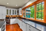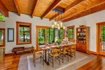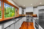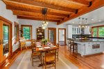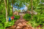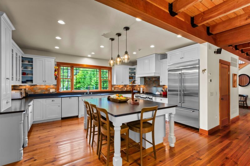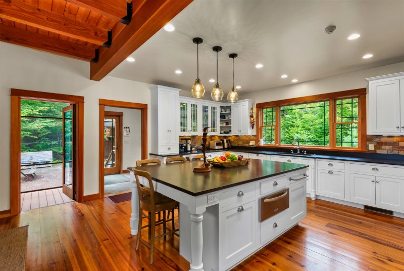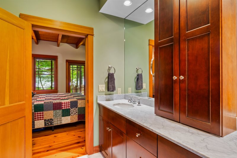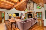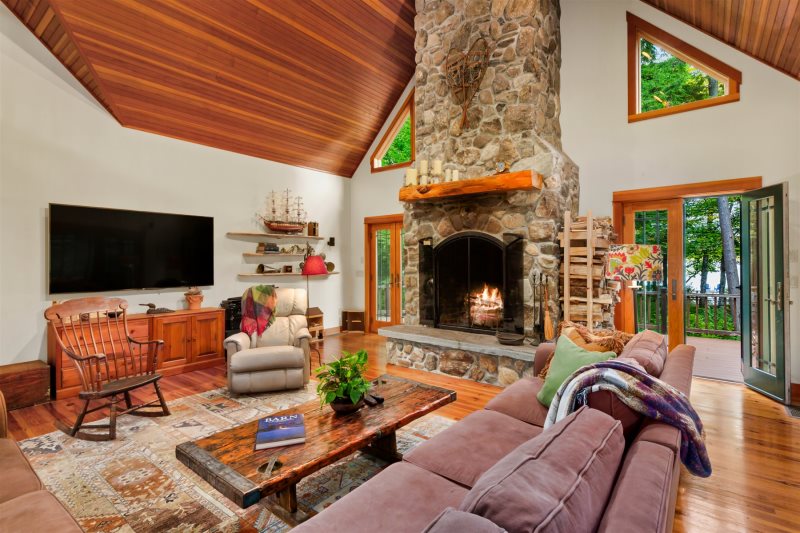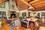 The main house welcomes you with spacious, light-filled interiors and thoughtful craftsmanship throughout. The chef’s kitchen is a true centerpiece, featuring an eight-burner, two-oven gas range, ice machine, and drink cooler—perfect for preparing family meals or entertaining. The open-concept living area features a soaring stone fireplace, cozy seating, and lake views framed by large windows that bring the outdoors in.