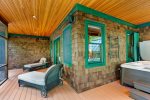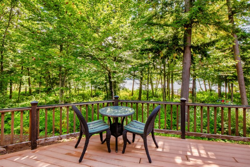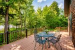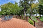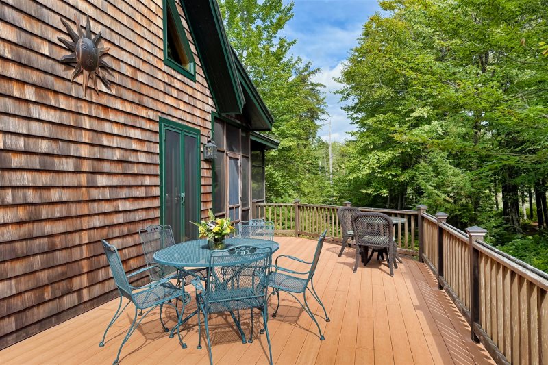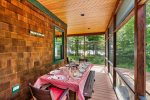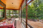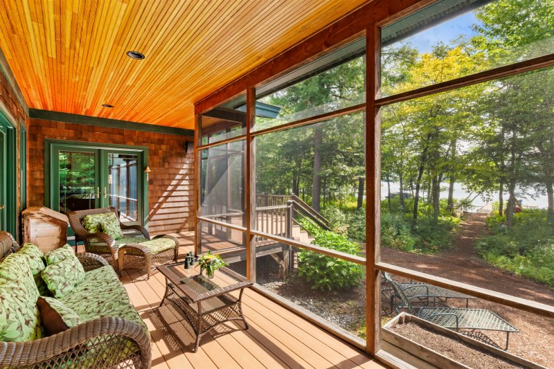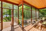 A screened-in porch provides the perfect spot for evening conversation, while a second screened porch with a private hot tub offers peaceful relaxation overlooking the trees. Outdoor amenities include a large sunny deck, a lakeside fire pit, two outdoor hot-water showers, and a spacious play area complete with a sandbox and outdoor play kitchen.