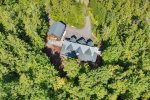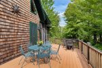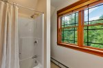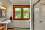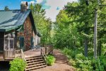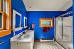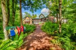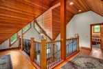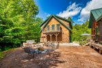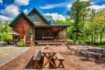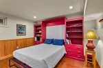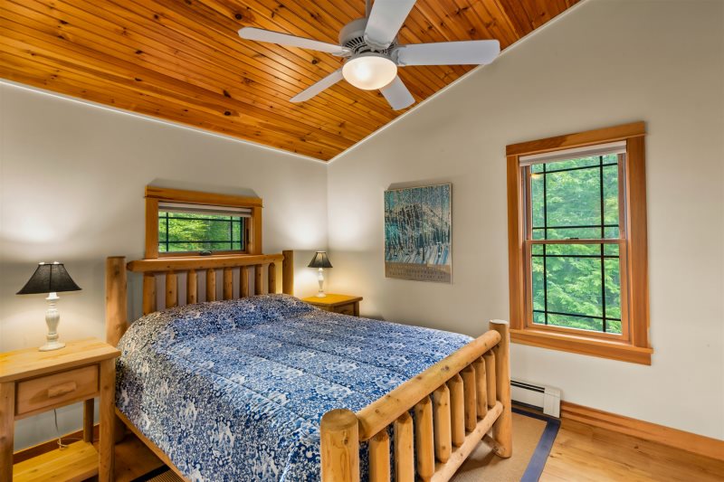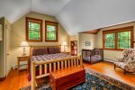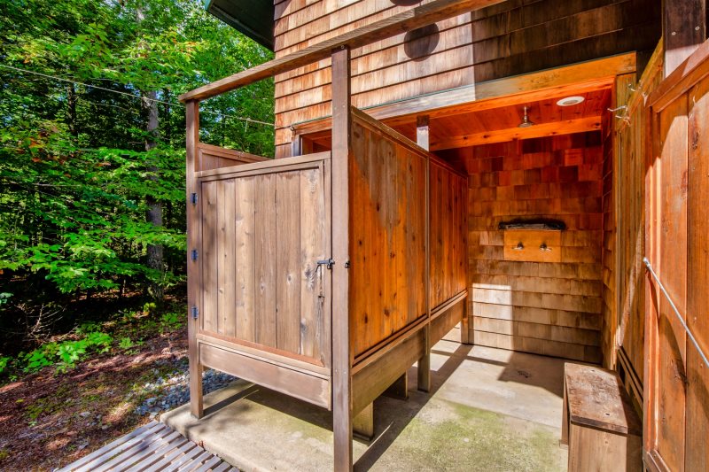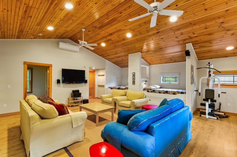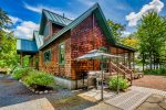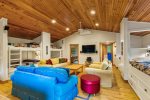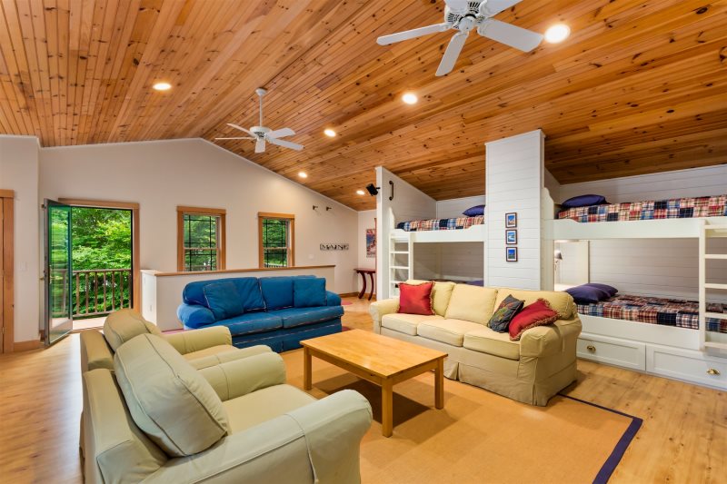 Across the driveway, the bunkhouse offers a perfect space for additional guests or older children, sleeping eight in total. The second-floor main room features six full-size bunks, while a separate bedroom offers a queen bed. The bunkhouse also includes a full bathroom, a convenient quarter bath, and easy access to the outdoor showers nearby.