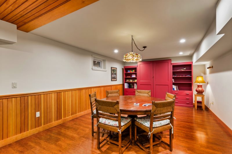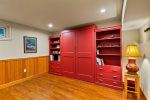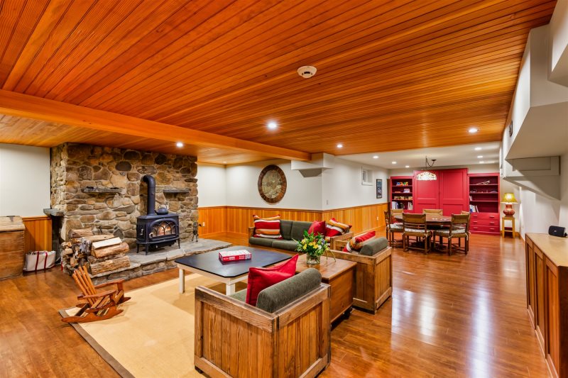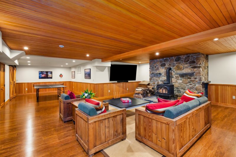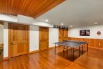 Lower Level: Recreation room with a ping pong table, game table, large-screen TV, queen Murphy bed, and full bath